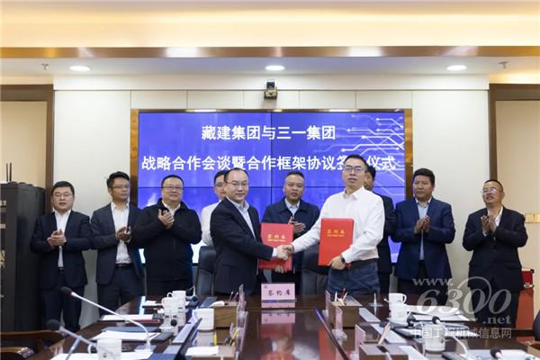 三一集团副总裁、工程车辆事业部董事长周国元,藏建集团党委委员、副总经理兼法律顾问陈鹏分别代表双方签约。